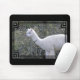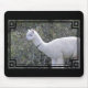 A imagem é emoldurada dentro de uma janela preta. Os quadrados são inseridos em cantos com uma linha que marca o acasalamento simulado do quadro. Alpaca branca em frente às árvores. Substitua a imagem por sua própria, se desejar.