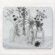 Uma vida estática de quatro garrafas cheias de flores brancas e apresentadas em preto e branco. Fotografia e trabalho de arte digital por Sandra Foster © Sandra Foster Designs - Zazzle.