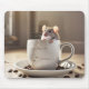 Rato bonito em uma xícara de café com rachaduras e grãos de café.