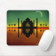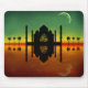 Ilustração noturna: Uma mesquita e uma silhueta de palmas em um fundo noturno com a lua e estrelas refletindo sobre a água.