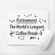 Reforma, A Mais Longa Quebra de Café do Mundo: um ditado humorístico para aqueles que se aposentaram. Este ditado de aposentadoria bonitinho mostra grãos de café em volta do texto negro da citação engraçada.