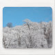 Uma queda de neve leve deixou uma camada branca em uma colina de árvores. O céu azul acrescenta um contraste distinto à cena.