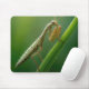 Uma visão de perto mostra um louva-deus orando empoleirado em uma folha verde de grama, destacando seus detalhes complexos e sua camuflagem natural