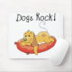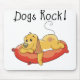Um cachorro marrom giro feliz relaxando na sua cama de cachorro e o texto preto diz "Cachorro Rock!" em nossas camisetas, canecas, mousépias, botões, cartas e muito mais!