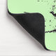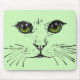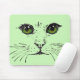 Este mouse pad para seu computador tem um desenho preto de uma face de um gato com bigodes longos e olhos verdes amarelos sobre um fundo verde-claro.