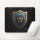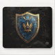 Mouse pad de alta definição com uma águia dourada foto-realista 3D em um escudo de cristal azul safira estilhaçado. Arte premium 8k com detalhes dourados intrincados e um fundo preto de mármore texturizado com veias douradas sutis. Perfeito para configurações de jogos de elite e decoração de mesa profissional.