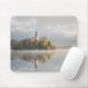 Mousepad com um nascer do sol nevoento no lago Bled com a ilha com igreja e névoa com reflexão na água na primeira luz solar da manhã em Slovenia.