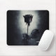 Um mousepad escuro e misterioso com uma ilustração legal de um rosa preto estilo gótico/émo com sangue vermelho pingando em suas pétalas. Um fundo preto de cor esbranquiçada no centro que destaca essa rosa macabra e modesta.