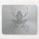 Um design tribal simétrico do sapo de árvore com redemoinhos e padrões de ponto intrincados. O design tem a aparência da gravação em um fundo de aço inoxidável