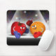 Mousepad que caracteriza uma maçã e uma laranja em um fósforo de encaixotamento.