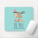 Um mouse pad com um ditado divertido: Seja você, o mundo se ajustará. Projetado com uma ilustração de uma preguiça marrom gira giro de cabeça para baixo. Esta pequena cara engraçada está segurando um galho que tem um pássaro rosa em um lado do galho e um buquê de rosa ao estilo rabisco do outro lado. Abaixo deles está um arranjo de flores coloridas desenhadas à mão. Esta preguiça adorável também tem bochechas rosadas rosa e 3 corações bonitinhos no seu bumbum. Fundo de cor aqua leve.