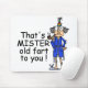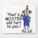 Atitude humorística de aniversário T-shirts, botões, canecas, ímanes, chaveiros, cartões, autocolantes e outros roupas de aniversário que incluem Gus com um chapéu de aniversário vestido com o seu roupão e pantufas dizendo "É um peido velho MISTER para ti!".