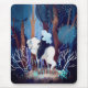 Ilustração digital mostra uma linda mulher em uma capa longa e preta em um cavalo cinza branco, parado em uma colina no meio de uma floresta mágica azul com animais selvagens numa noite escura
