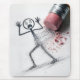 A pink pencil eraser is actively erasing a hand-drawn stick figure with a shocked expression, leaving behind scattered shavings on the white paper