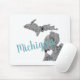 Placa de Mouse Silhouette Cheia Floral de Michigan. Michigan Floral encheu Silhouette com "Michigan" na tipografia cursiva. Um presente de excelente para qualquer Michigander no coração. Este mouse pad tem a silhueta de Michigan preenchida com um padrão floral de papoila em cinza e blues com um coração branco. Design de The Michigander.