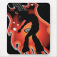 Refrigere o mousepad/mousemat pretos com uma silhueta de uma dança do cantor do punk rock em um fundo alaranjado groovy da guitarra da chama - @ www.vectorportal.com. Um presente impressionante na moda para os adolescentes, os melómanos e o qualquer um GROOVY!!