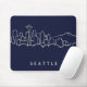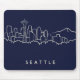 Características deste design um esboço tirado mão da skyline de Seattle em um fundo azul escuro.
