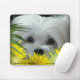 Uma fotografia de Snowdrop, um maltês pequeno doce, olhando através de alguns girassóis.