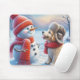 Um bonitão e um filhote adoráveis, ambos vestindo roupa de inverno quente, compartilham um momento nevado sob um céu colorido