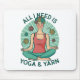 A frase "A mulher meditando com fio, tudo que preciso é de Yoga e Yarn" sugere que a mulher acha que yoga e fios se comportando são aspectos importantes de sua vida. Ao combinar as duas atividades, ela é capaz de alcançar uma sensação de relaxamento, atenção e criatividade. Esta frase destaca a ideia de que encontrar alegria e contentamento pode ser tão simples quanto desenvolver as atividades que nos trazem mais felicidade e paz, seja o yoga, a confecção de fios, ou qualquer outra coisa que fale com nossas almas. Tanto o yoga como a confecção de fios podem ser atividades solitárias que permitem a introspecção e a autorreflexão, fazer-os de um pareamento natural para aqueles que buscam um estilo de vida pacífico e cumpridor.