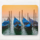 Um cenário pacífico ao lado do Palácio do Cachorro em Veneza, Itália, com quatro gondolas, todos juntos apontando para um belo pôr do sol.