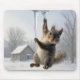 A cute squirrel playfully dangling from an icicle just outside a window, curiously peering inside
