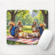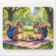Two squirrels with blue backpacks are playing chess on a red and white checkered blanket in a sunlit park