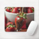 A ripe, luscious strawberry is coated with a rich layer of melted chocolate, with several fresh strawberries in the background