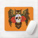 Uma coruja marrom excelente com um dia de crânio de açúcar morto e rosas vermelhas num pano de fundo de laranja.