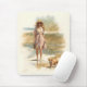 Pintura de uma mulher andando pela praia com seu cachorro.
