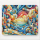 A textured artwork of an abstract colorful city with the sun rising