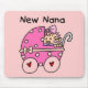 Um bebé adorável em uma carruagem cor-de-rosa e o miúdo denominam o texto que lê "Nana nova" em t-shirt novos de Nana, canecas, cartões, etiquetas, sacolas, ímãs, botões, e outros roupa e presentes novos de Nana.