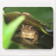 Sapo pequeno que espreita para fora de debaixo de uma almofada de lírio