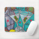 Martinis corajosos, coloridos e abanador pintados em uma composição retro, colorida, vívida pelo artista popular, emergente Lisa Lorenz em um tapete do rato.