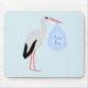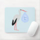 Este incrível mouse pad apresenta uma imagem gráfica de uma linda Stork branca com penas pretas na cauda segurando um pacote azul pálido de cobertores. Há um texto azul no pacote que diz "Menino". Esta design é perfeita para celebrar um menino.