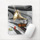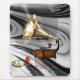 Tempo no tapete do rato retro. Gramofone com cor-de-rosa e um pulso de disparo em um fundo preto e branco retro do redemoinho.