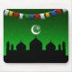 Ilustração colorida com uma pátria festiva numa cena noturna mágica com uma silhueta mesquita e a lua e estrelas num céu noturno verde.