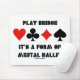 Mostre o lado da ponte desejada com este mouse pad com quatro naipes de placa junto com a seguinte ponte: "Toque Ponte É uma Forma de Balé Mental". Faça com que os outros façam uma dupla jogada da próxima vez que você jogar ponte com uma dose de humor intelectual com este bocal!