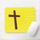 Mousepad com a ilustração de uma cruz sobre raios claros amarelos.
