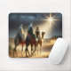Três viajantes em camelos caminham em direção a uma estrela iluminada no céu noturno lançando um brilho suave na paisagem