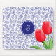 Tulipas vermelhas Elegante primavera floral, Pad do Mouse com estilo azul Delft holandês. Personalize este elegante Mouse Pad com o seu monograma/inicial.
