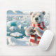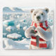 Urso polar vestindo um cachecol listrado vermelho e branco sobre uma geleira formando forma cardíaca com suas patas