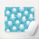 Mouse pad com um lindo padrão de Natal com ursos polares em pé sobre gelo flutuante vestindo chapéus de anã vermelhos. Pequenos iglos, flocos de neve e peixes cercam esses adoráveis ursos polares se resfriando na água. Fundo azul claro. Design de férias bonitas e caprichosas.