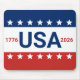 Celebrating the USA's 250th anniversary. This red, white, and blue mousepad has the word 'USA' in the center. The years 1776 and 2026 are next to USA. The top stripe is blue and has white stars. The center stripe is white. The bottom stripe is red with white stars.