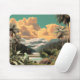 A imagem mostra uma paisagem tropical vibrante com vegetação exuberante, palmeiras altas e um rio sereno enrolando por um vale. Ao fundo, as montanhas subem em um céu cheio de grandes nuvens de ouro. O primeiro plano é rico em diversas plantas e flores coloridas. A atmosfera é pacífica e sonhadora, com foco na beleza natural.
