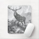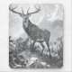 Linda ilustração de cervo preto e branco nas montanhas altas. Um veado macho com galhadas é seguido por dois outros cervídeos ao lado de uma montanha à distância. Por volta de 1890, Thiele