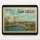 Design de San Diego Califórnia no estilo das viagens vintage que caracteriza uma caro opinião da skyline da cidade com o porto no primeiro plano.