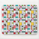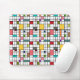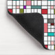 Este mouse pad tem um médio do século design de uma grade de linhas pretas com quadrados e retângulos em cores retrorativas em um campo de branco.