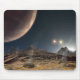 Vista de uma lua hipotética em órbita em torno do primeiro planeta conhecido a residir num sistema de três estrelas de malha apertada