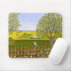 Um mousepad com uma bela imagem de uma cena da natureza: um pássaro sentado em uma cerca desgastada, flores silvestres crescendo ao redor da cerca, um agricultor em um trator, trabalhando em sua terra, árvores com folhas e terras agrícolas com várias cores. Obra original de W.B.
